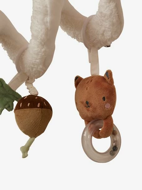 - 3 hanging toys with wooden rings: – a velour bear squeaker with 3 hanging plastic rings – a velour acorn with embroidery and a vibrating cord, and a leaf in embroidered velour, a velour squirrel with chime + transparent plastic ring with colourful beads and 3 ribbons