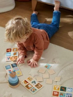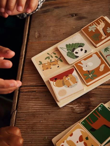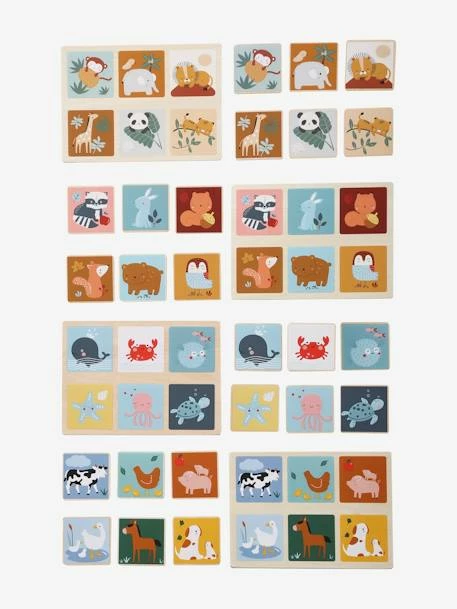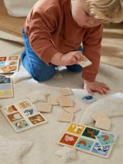 The rules of this wooden Lotto: each player has one or two boards before them. They then each take a wooden piece in turn. If the animal on the piece is similar to one on the player’s board, the player must then place the piece on the board! The first to fill the board is the winner!