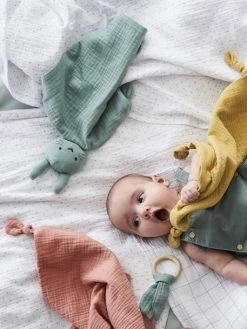 This lovely baby comforter toy comes in a fabric pouch with a round wooden rattle: a perfect baby shower gift! The baby comforter will help soothe baby and make him feel wrapped in softness…