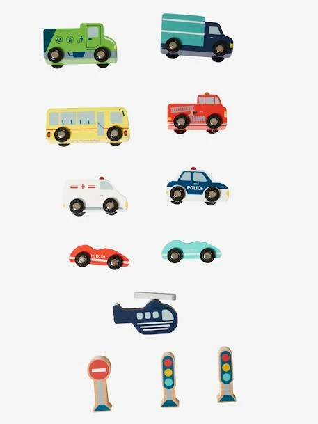 - Cars, fire engine, rubbish truck, police car, traffic lights, “no entry” sign, road barriers, ambulance, van, helicopter, bus.