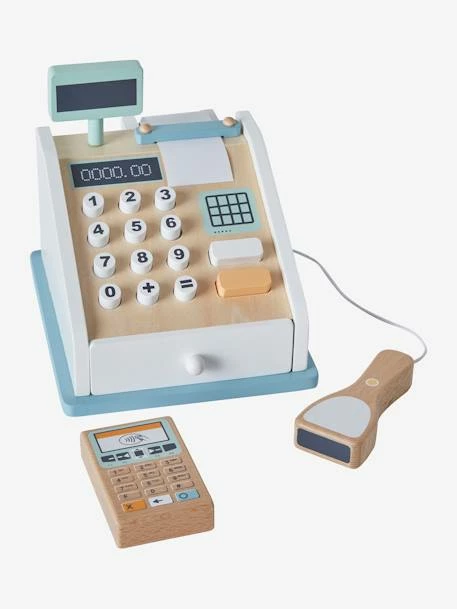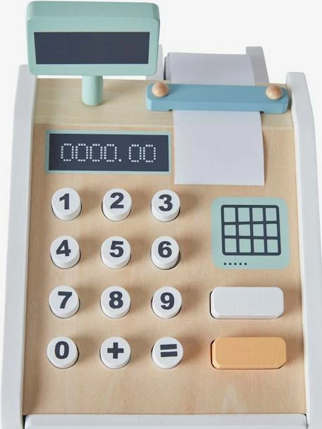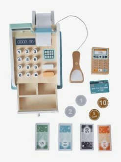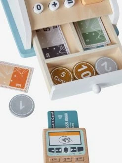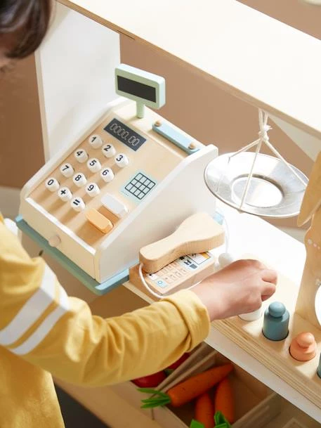 A good shop assistant needs a professional cash register! Coins, bank notes, a credit card reader, and a roll of paper… it’s all here so that children can imitate the grown-ups and teach them to count money!