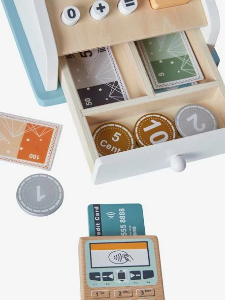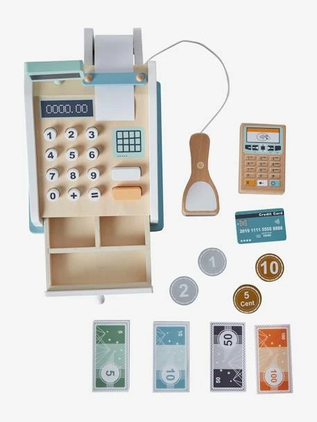 - Set includes: 1 cash register, 1 card reader, coins, bank notes, and 1 roll of paper for purchase receipts