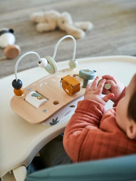 A small activity table that is easy to take everywhere with baby. It features an abacus and other little surprises for baby to discover and be stimulated by!