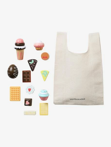 A pouch with cakes and chocolates in FSC® wood; pouch: 50% cotton, 50% polyester.