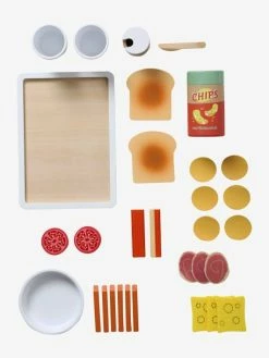 - Set includes: 2 glasses, 1 platter, 1 bowl, 1 pot of sauce with knife, 6 wooden crisps in a cardboard box, 2 crab sticks, 2 tomatoes slices, 6 carrot sticks, 2 slices of toast, 3 slices of cheese in felt, 3 slices of salami in felt