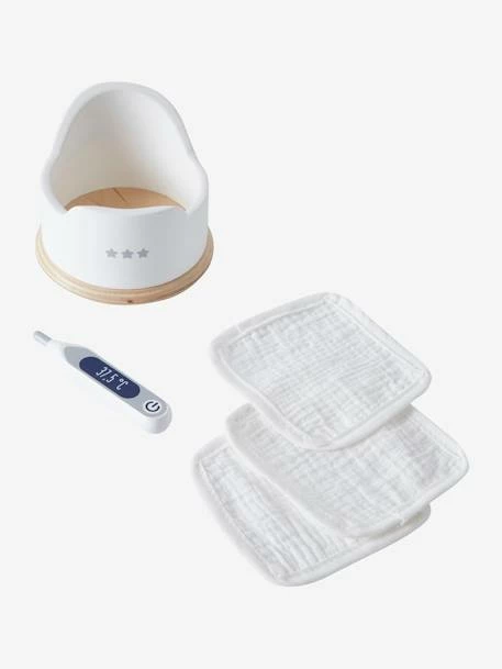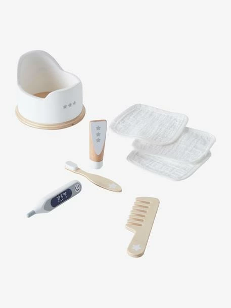 - Set includes a bib, a potty, a thermometer, toothpaste, 3 nappies, a toothbrush and a comb