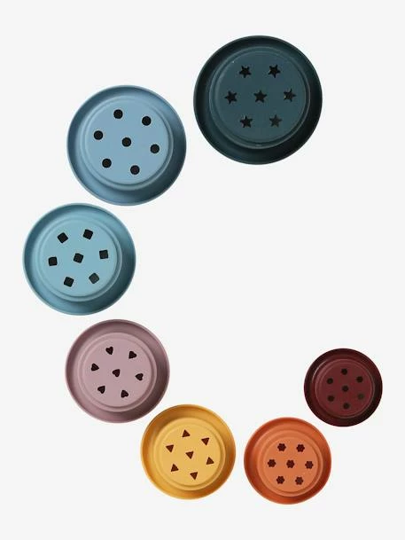 7 stackable cups in silicone to create a pyramid! Trendy and ideal for kids, silicone is soft, safe to chew and can also be used in the bath. Each cup features different shaped holes at the bottom to play with water and keeps kids endlessly entertained!