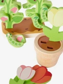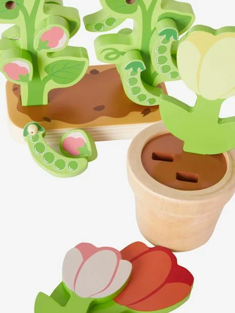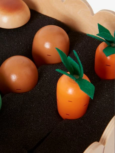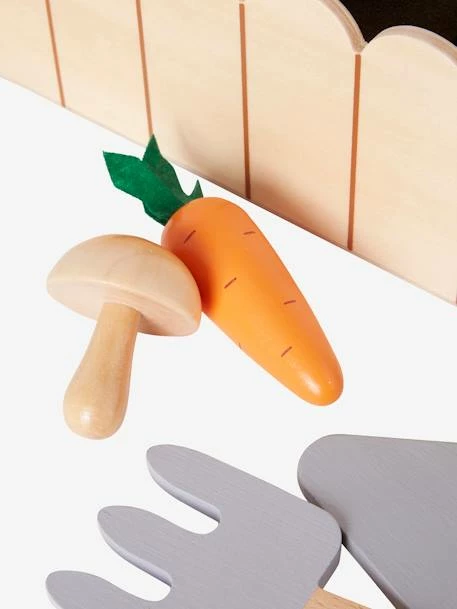 - Includes: a small wooden vegetable tray, with wooden vegetables: carrots, mushrooms, broccoli, potatoes, a flower pot, a shovel, a rake, a watering can, a small flowerpot with beans and flowers to harvest and packets of seeds in wood.